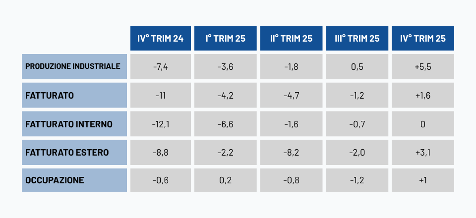 Analogamente, il fatturato totale (+1,6%) evidenzia un recupero limitato, sostenuto dalla componente estera (+3,1%), mentre il mercato interno resta invariato (0,0%), a testimonianza di una domanda domestica ancora fragile.