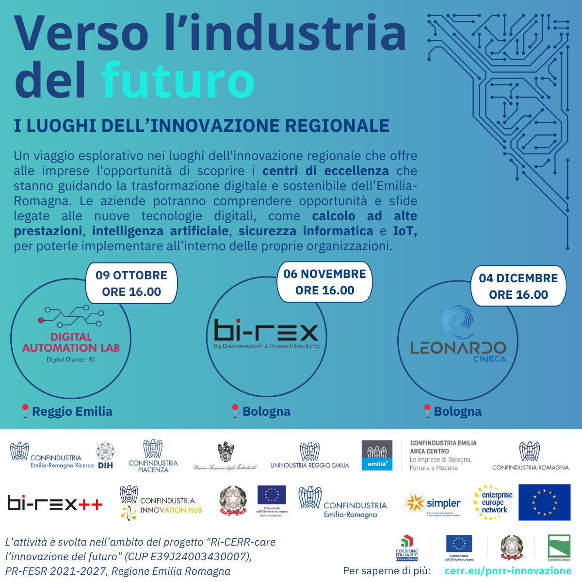 Il roadshow “Verso l’industria del futuro: i luoghi dell’innovazione regionale” è organizzato da Confindustria Emilia-Romagna Ricerca (Digital Innovation Hub Emilia-Romagna di Confindustria) e dalle Associazioni Industriali Confindustria Piacenza, Unione Parmense degli Industriali, Unindustria Reggio Emilia, Confindustria Emilia Area Centro e Confindustria Romagna, in qualità di Antenne Territoriali, nell’ambito del progetto “Ri-CERR-care l’innovazione del futuro”, in collaborazione con i progetti BI-REX++ e ConfIN-Hub e con la rete Enterprise Europe Network.